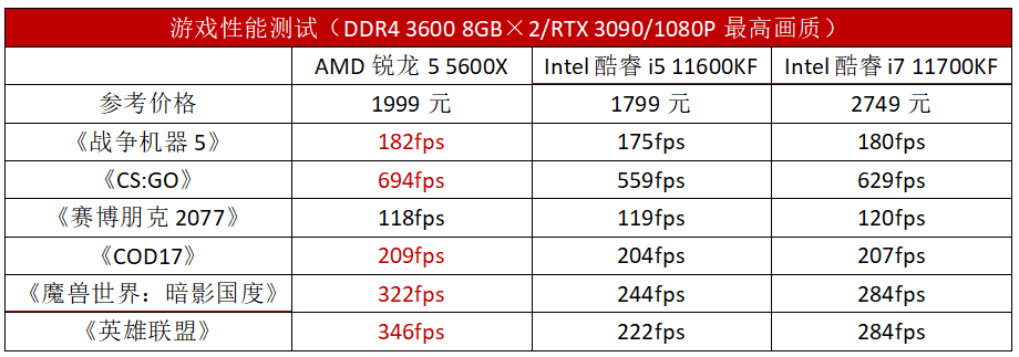 从具体的游戏表现来看,因为单核性能上的优势,锐龙5 5600X在网络游戏中的表现堪称惊艳!在《魔兽世界:暗影国度》、《英雄联盟》和《CS:GO》这样的网络游戏中,最高领先酷睿i5 11600KF的幅度达到了50%以上,面对酷睿i7 11700KF依然保持了10%~22%的领先。在单机大作的测试当中,锐龙5 5600X除了在《赛博朋克2077》当中以微弱的劣势小负对手之外,其他游戏当中同样不处下风。搭配RX 6700XT,在2K分辨率下玩转各种单机大作都不成问题。