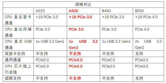 由于B550在规格、用料上的提升,不少用户都觉得其价格偏高了,所以最近才上市的A520或许是大家更好的选择。与之前A320产品孱弱的用料不同,A520在规格、用料上的表现都不错。从整体规格上来看,A520的通用通道(General Purpose Lanes)规格也升级到了PCIe3.0,显然B450芯片组PCIe2.0的规格已经不再适合未来处理器的需求。同时在USB接口的支持方面,A520芯片组也提升到了USB3.2 Gen2。相比B550而言,A520去掉了PCIe4.0的支持,在芯片组部分则是缩减了一个USB3.2 Gen2支持和2个SATA接口支持,同时去掉了超频支持。考虑到PCIe4.0的支持对于入门级玩家来说需求不算太高,所以这样看来,A520芯片组相比B550芯片组其实并没有太多的精简,对于入门级和甜品级玩家来说已经足够满足需求了。
