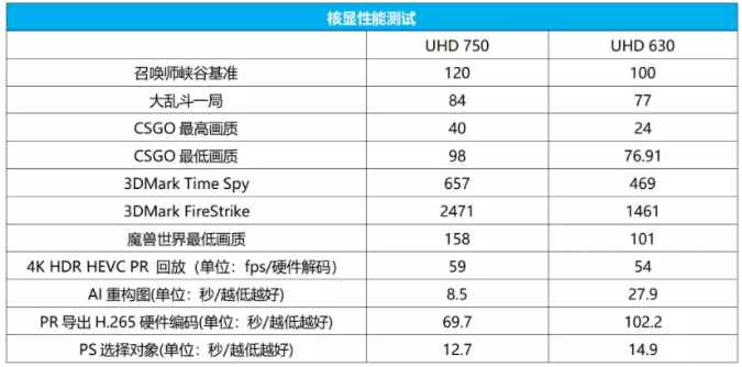 在性能上,UHD 750相比UHD 630的性能优势大约在9%~69%,其中《CS:GO》的帧率优势高达67%,而3DMark Firestrike的优势也高达69%。《英雄联盟》中的帧率优势在9%~20%,实际操作的感觉还是很明显。而《魔兽世界:暗影国度》高达56%的帧率优势在下副本的时候差别就很明显了。此外,UHD 750在视频回放和AI方面的硬件加速性能也更加突出,特别是AI重构图和PR的H.265硬件编码方面,相对UHD 630的提升巨大。