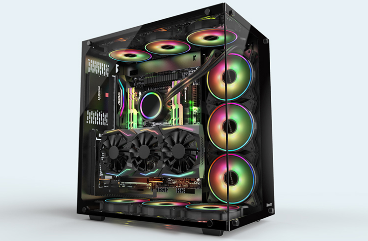 航嘉MVP Apollo阿波罗是一款采用左右分仓结构的高塔机箱,采用双钢化玻璃透光面板的设计,任何带有酷炫灯效的机箱内配件都可以通过它完美地展示出来,而且机箱内提供了总共11个风扇安装位,安装上RGB风扇视觉效果非常震撼,侧向安装的3个RGB风扇特别抢眼。
