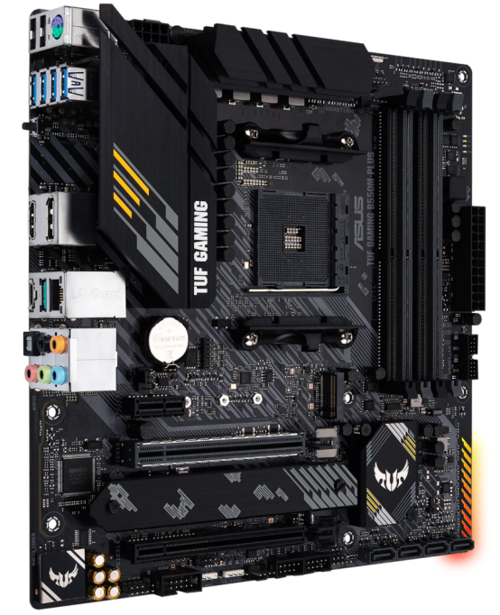 主板方面站长选择的是华硕TUF GAMING B550M-PLUS 重炮手,之所以不推荐B450,是因为这款主板方案更新,升级为8+2组Dr.MOS供电模组,拥有TUF电感和TUF电容等基础上又加入了军规级铜层散热3+设计,拥有2Oz(70um)PCB铜箔层,让工作更稳定。主板还板载2个M.2插槽,主插槽直连处理器,通道上使用PCIe4.0 ×4,磁盘性能更强大。另外主板还有优秀的声音体验和网络性能,整体表现出色,价格也就比B450贵100多元,站长觉得这钱值的花。