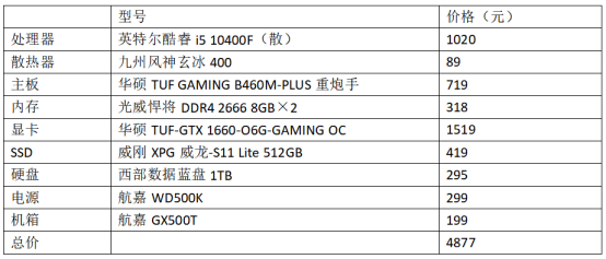 除了网游外,你还有一些单机游戏需求的话,那么酷睿i5 10400F+GTX 1660的组合是有必要的。之所以没选酷睿i5 10500,是因为站长觉得高出的一点频率对游戏性能提升有限,还不如将200元左右的预算节约下来,加到显卡上或者是给SSD扩容,得到的性能提升更为明显。而考虑到要用独显,所以酷睿i5 10400的核芯显卡不就浪费了,酷睿i5 10400F更合适。
