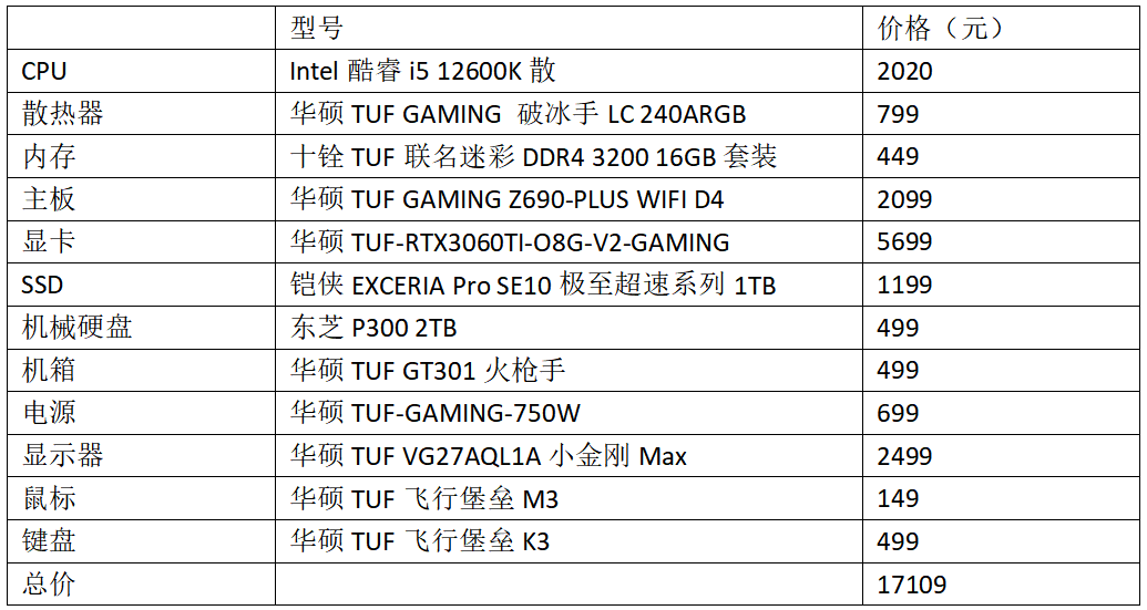 为了保证整机外观风格的统一,能看得见的硬件,包括散热器、内存、显卡、机箱、显示器、键盘、鼠标方面,站长此次都选择了华硕TUF产品或是联名的产品。