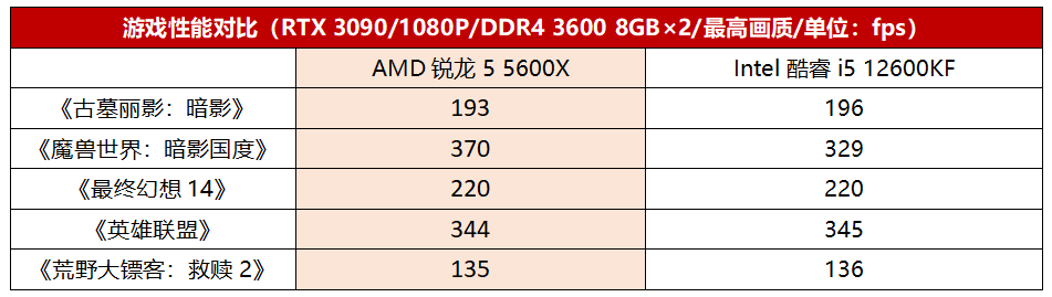 在《魔兽世界:暗影国度》中,锐龙5 5600X的成绩为370fps,大幅领先于酷睿i5 12600KF的329fps,这也是所有测试项目中,差距最为悬殊的一项。