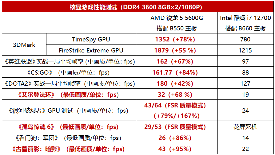 结合实际数据来看,锐龙5 5600G的游戏性能表现全面碾压集成了UHD 770的酷睿i7 12700。在《英雄联盟》《CS:GO》《DOTA2》等网游中,锐龙5 5600G获得的画面帧速都在160fps之上,足以保证游戏的流畅运行。同时配合FSR黑科技之后,在运行《银河撕裂者》《孤岛惊魂6》,画面帧速也有了极大的提升。在时下最火的《艾尔登法环》中,锐龙5 5600G的画面平均帧速也能达到32fps,可以实现流畅运行。