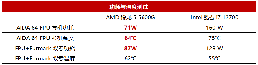 得益于7nm工艺的加持,锐龙5 5600G在双考机下,功耗也就87W,单考处理器时温度最高也才64℃,这样的表现称得上是能效比出色,特别适合内部空间局促的小机箱使用,减轻主机的散热压力。
