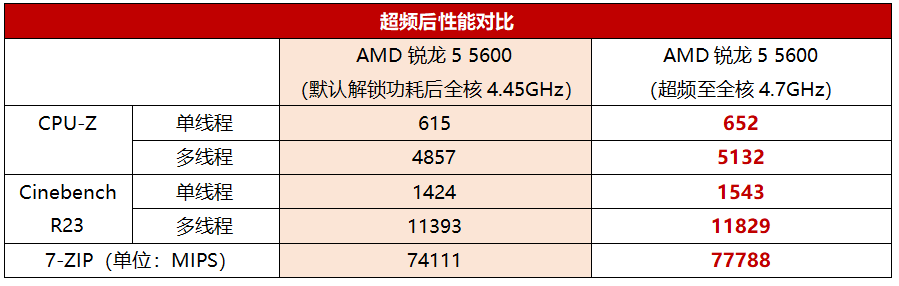 与同价位的竞品酷睿i5 12400F相比,两者在核心数量、最高频率方面是一致的,不过锐龙5 5600拥有容量更大的三级缓存,得益于更先进的工艺功耗更低,最为重要的是这款处理器支持超频。由于锐龙5 5600出厂日期非常靠后,制造工艺更加精熟,因此在超频体质方面的表现很值得期待。根据《电脑报》之前的实测,锐龙5 5600能达到全核4.7GHz的最高频率。超频后锐龙5 5600的性能提升非常明显,特别是单核性能,这对于游戏帧率的提升很有帮助。