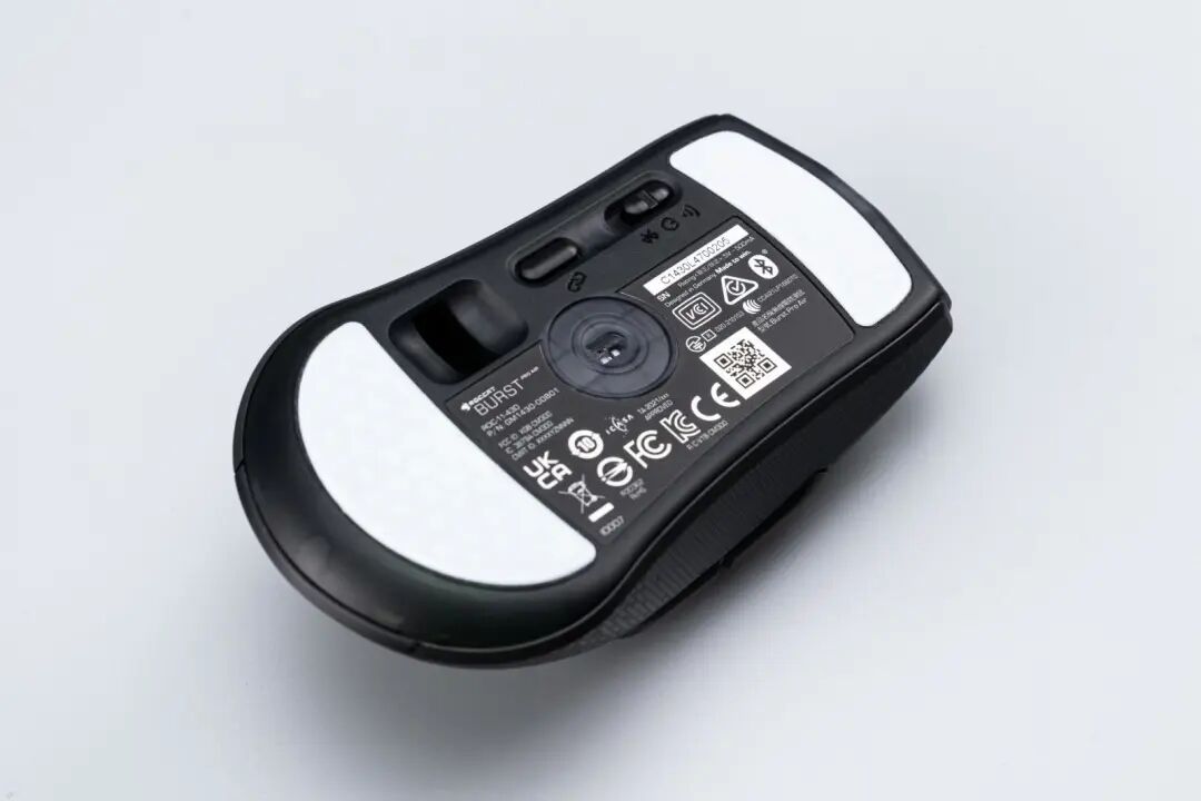 ROCCAT Burst Pro Air的底壳也是半透材质,配备了两块大面积的白色纯PTFE热处理脚贴,经过了特殊的出厂调校,移动时的摩擦阻力非常小。这款鼠标搭载了第二代Owl-Eye 19K夜枭之眼光学传感器,最高可提供19000DPI,拥有50G的加速度以及400IPS的跟踪速度。功能键位于底部左侧,从上至下分别是连接模式切换开关、配置文件切换键、以及一个2.4GHz适配器的收纳槽。