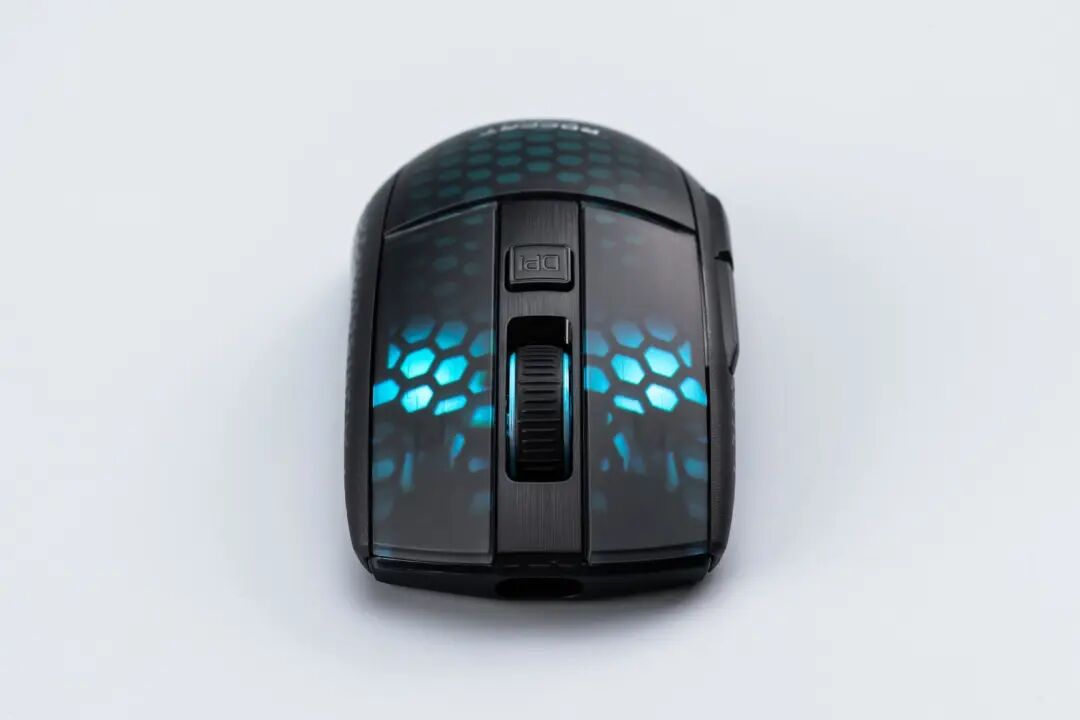 鼠标的主键和外壳之间可以看到两条很明显的凹槽,但如果仔细观察会发现它和鼠标的外壳是一体的,一体式按键的好处是可以借助材料本身的记忆力,做到更加一致的回弹手感。与主键搭配的Titan Optical Switch(泰坦光轴微动),拥有1亿次敲击寿命,响应时间比一般的机械微动更加迅速。滚轮采用了透光结构,刻度感清晰,手感轻盈。滚轮后有一颗方形的DPI切换键,按键的面积很大,触发轻松。