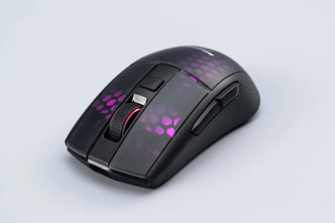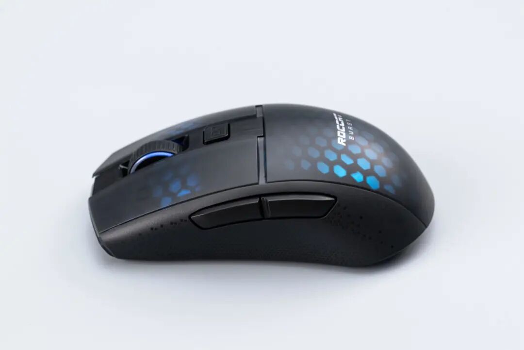 一般来说,轻量化无线鼠标为了更好地控制重量以及保证续航,通常会对灯光进行简配。但ROCCAT Burst Pro Air在原有灯光配置的基础上,又增加了左右两枚主键的灯效,一共拥有4区可调灯效,配合科技感十足的六边形蜂巢造型,在灯光的映衬下能够很好地展现AIMO灯光效果。正因为无线化元器件和灯光方面的“增配”,让ROCCAT Burst Pro Air的重量也增加了不少,实测机身重量为80.7g,比有线版的Burst Pro 重了13g左右,不过足够满足大部分玩家的使用需求了。