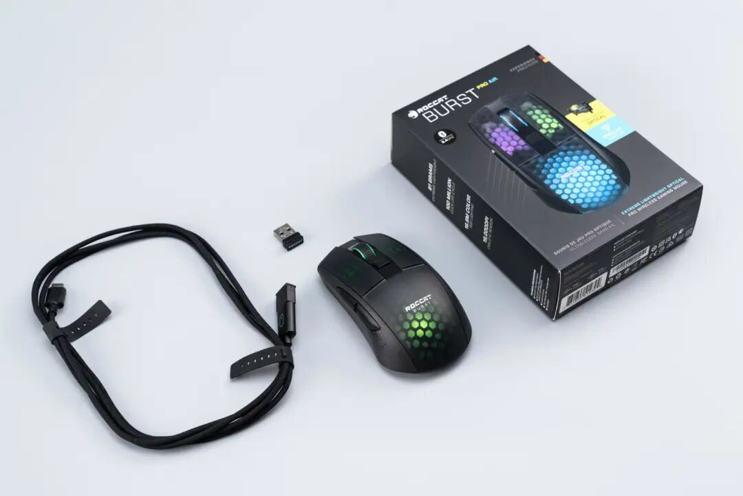 知名外设品牌冰豹ROCCAT在三月初的时候推出了Kone XP高端游戏鼠标,我们也对它进行了测评,该鼠标具备极富特色的3D RGB灯效以及可玩性很高的按键系统,不过可惜的是仅支持有线连接。而Kone XP推出后不久,冰豹又亮相了一款新产品——ROCCAT Burst Pro Air极光豹无线精英版游戏鼠标,作为Burst Pro的无线版本,它搭载了三模无线连接方案和最新的Owl-Eye 19K夜枭之眼光学传感器,同样是一款很有特色的产品。