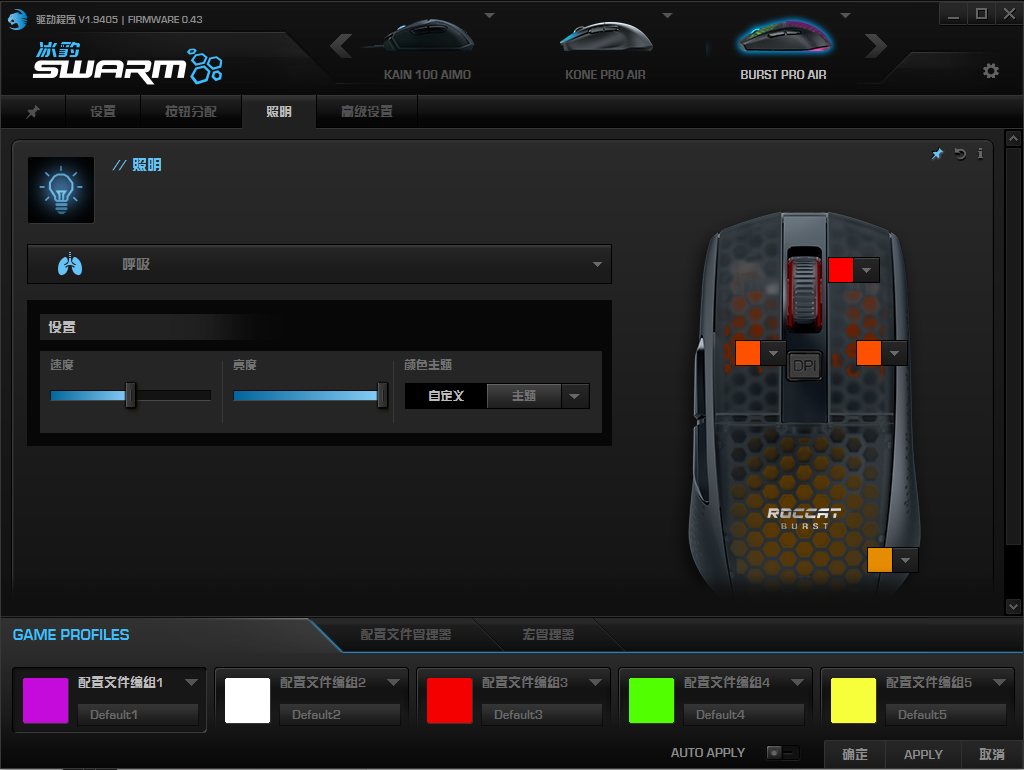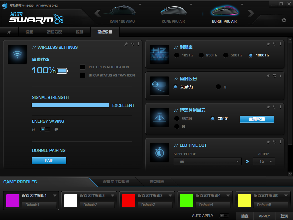 设置方面,ROCCAT SWARM驱动软件提供了丰富的鼠标设置选项。主界面提供了基本设置、按键分配、灯效设置和高级设置四大功能模块。鼠标板载存储中最多能保存5个配置文件,按下鼠标底部的配置文件按钮即可快速切换DPI水平和灯效。在“照明”界面中提供了AIM灯效、波浪、全亮、心跳等七种预设灯效,每一种预设里面还有更详细的调节选项,配合其他冰豹设备能打造出炫酷的个性化灯效高级设置页面提供了电量显示、信号强度展示、右侧还提供了回报率设置、直线修正,LOD高度、去抖动时间及重置功能,方便玩家根据自己的操作习惯对鼠标进行配置。