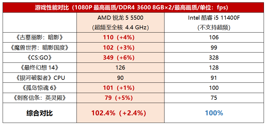 与定位价格相近的酷睿i5 11400F相比,在基础频率和三级缓存容量方面都不如锐龙5 5500,同时也不支持超频,没有可以挖掘的潜力。就实际表现来说,只要将锐龙5 5500超频至全核4.4 GHz,游戏性能上就能超越酷睿i5 11400F。而且6核处理器应付一些轻量级的生产力工程也是可以搞定的。不过,从实测来看,酷睿i5 11400F和锐龙5 5500在吃多线程性能的3D渲染类生产力应用中的差距就显得很大了,锐龙5 5500在3项3D渲染测试中相对酷睿i5 11400F有10%~32%的巨大优势。