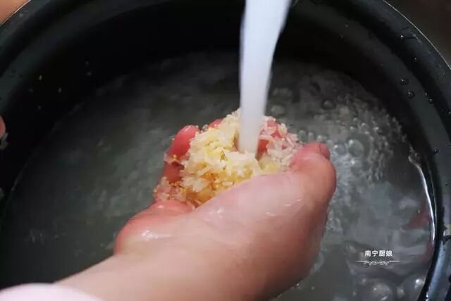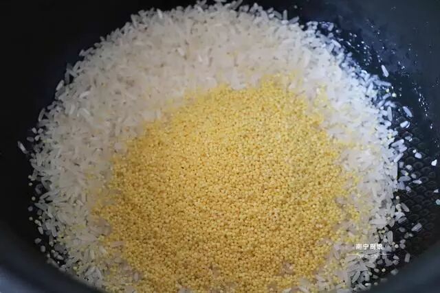 1、把大米和黄小米倒入锅中,然后倒入清水淘洗2次,再倒入没过大米一个手指节的清水。