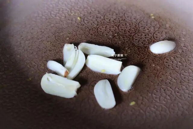 3、再次倒入适量油,小火烧热油,把蒜片倒入爆香。