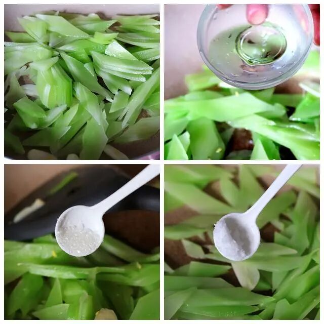 4、把莴笋片倒入锅中,调大火翻炒,倒入40毫升清水继续翻炒,再放入一小勺食盐和白糖调味。