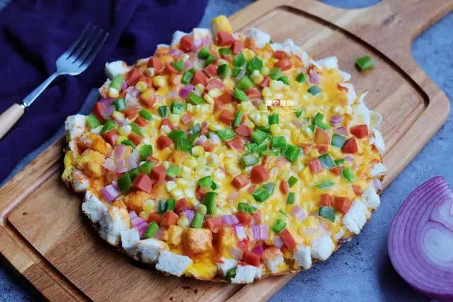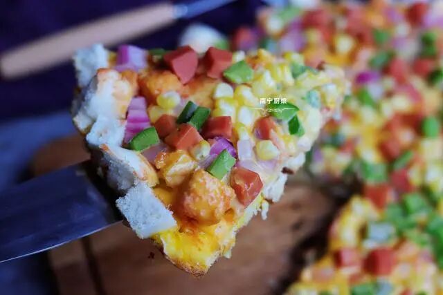 4、大家可以脑洞大开一下,不仅可以用馒头来只披萨,其实吃不完的面包也是可以的,大家可以多尝试下,肯定有很多惊喜。