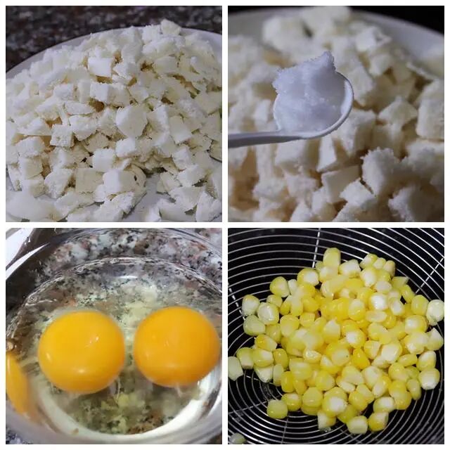 1、把馒头切成小块装盘待用,然后在馒头水中放入适量食盐,把2颗鸡蛋打入碗中打散备用,在锅中烧热半锅水,把玉米粒倒入锅中焯水煮熟后捞出沥干水分备用。