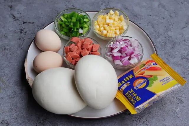 准备好食材:干馒头2个、鸡蛋2个、洋葱小半个、玉米一小段、香肠半根、青椒一小颗、番茄酱适量、奶酪适量、清水适量、食盐适量、食用油适量。