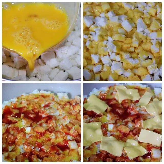 2、小火烧热平底锅,在锅底均匀地涂上黄油,然后把馒头碎平铺在锅底,用锅铲轻轻地按压。把鸡蛋液均匀地淋在馒头上。刷上酱料:等锅中的馒头底部融合在一起定型后,调成中火,在表面刷上一层番茄酱,再在饼皮上围绕一圈放上奶酪片。