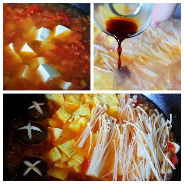 步骤5:番茄汤烧开后,先将香菇、金针菇放入煮一会儿,再将豆腐和鸡蛋皮放入,中火煮5分钟,根据口味加入适当的盐和生抽调料,然后就可以出锅啦!番茄菌菇豆腐汤出锅后,大家还可以根据自己的喜好加一点葱和香菜,使这道汤看起来更加的色香味俱全。