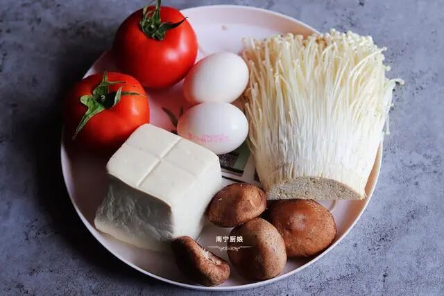 用料:番茄2个,鸡蛋2个,韧豆腐1块,小葱1根,蒜2瓣,食用油10g,盐3g,生抽10g,鲜香菇4朵,金针菇60g。