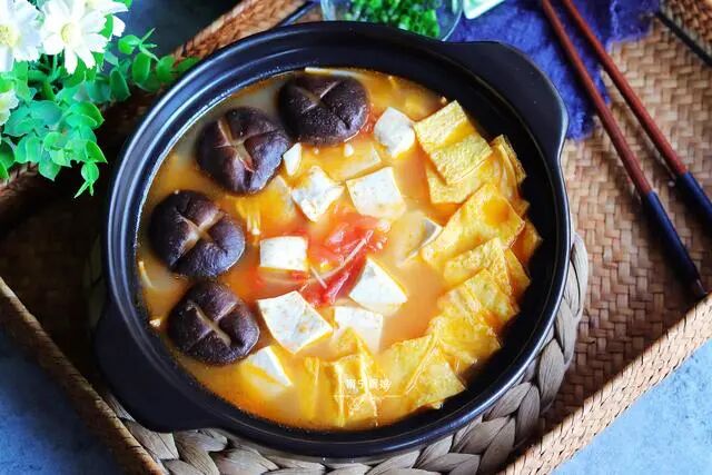 番茄加菌菇和豆腐,煮出来的汤也太好喝了吧!眉毛都快鲜掉了