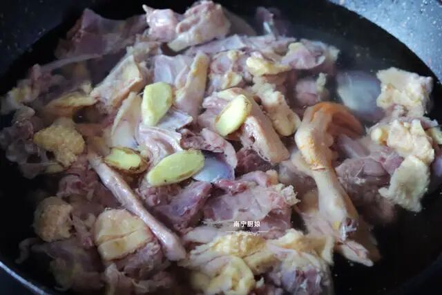1、鸭肉下锅翻炒前,我们先放入锅中,放生姜加水焯水一次,然后放到水龙头下冲洗掉浮沫沥干,这样可以可以去除鸭肉的膻味。
