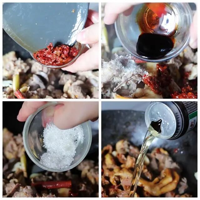 5、放入豆瓣酱、小米辣、生抽、老抽、白糖和没过鸭肉的啤酒。