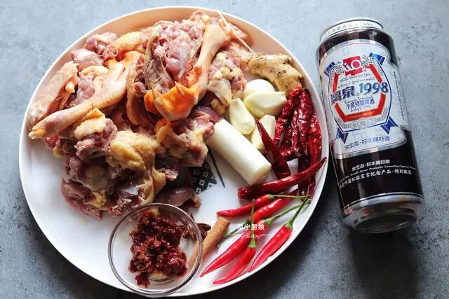 准备好食材:鸭肉500克、啤酒1灌、小米辣5颗、干辣椒6颗、豆瓣酱1勺、大葱段1段、大蒜4粒、生姜1块、八角1颗、桂皮1段。