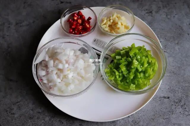 第一步,将皮皮虾清洗干净,做好处理后均匀地蘸上玉米淀粉。注意淀粉不要放太多,可以适当抖动一下,把多余的淀粉给抖下来。把洋葱、大蒜、小米椒和青椒洗干净,切成一粒粒备用。