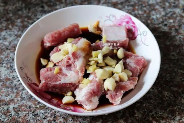 第一步,先把排骨洗干净,然后切成块,装进碗里备用。接着将生姜、大蒜洗干净,切好放进装了排骨的碗里,再加入蚝油、生抽、白糖、盐、老抽,戴上手套不断搅拌,让排骨均匀腌制。