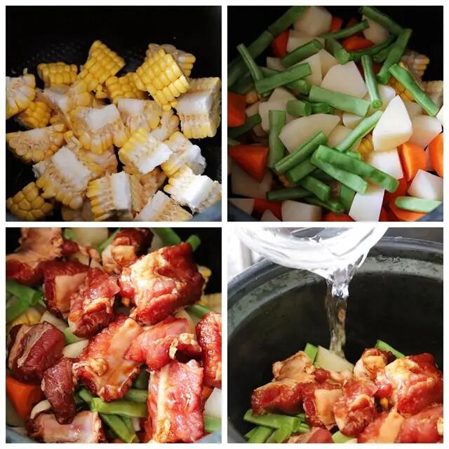 第二步,把玉米、胡萝卜、四季豆洗干净后切好放进电饭锅里,再把土豆削皮切成块也放进电饭锅里。接着把腌制好的排骨,一块一块地在电饭锅里码好,然后倒入清水,盖上锅盖,开启标准煮饭模式。