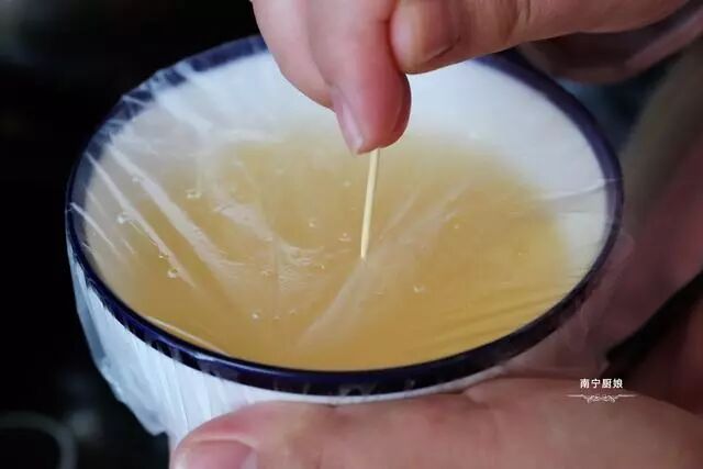 3、用保鲜膜盖住碗口,然后用一根牙签在保鲜膜上扎小孔,至于扎几个孔,我的建议是不少于6个。在锅中烧热半锅水,然后把蒸盘放入锅中,再把装入鸡蛋液的碗放到蒸盘上,盖上锅盖,调大火蒸10分钟,时间到之后,关火继续焖2分钟即可。