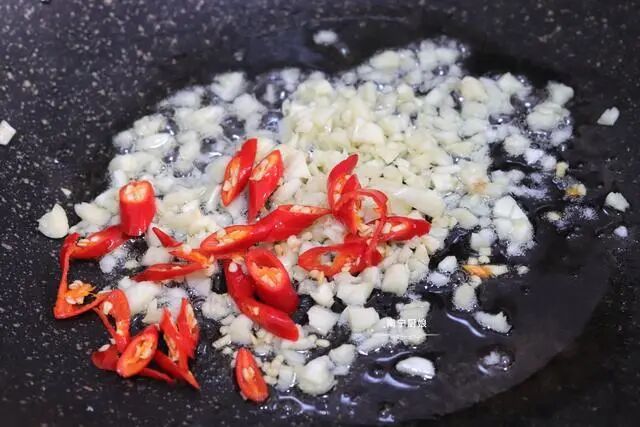 第三步,开小火热锅,等到锅面干了就倒入花生油,花生油烧热后,放入小红椒和蒜粒,均匀翻炒煸香,接着倒入茄条,不断翻炒把茄条炒软。