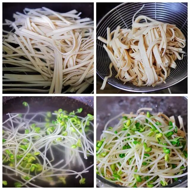 2、在锅中烧热半锅水,然后把千张放入焯水2分钟左右后捞出沥干水分待用。接着把豆芽也放入热水中焯水半分钟后捞出沥干水分待用。