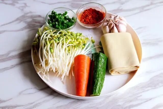 准备好食材:黄瓜一小段、胡萝卜半根、豆芽150克、豆皮150克、大蒜1颗、辣椒粉半勺、葱花2颗、白糖半勺、食盐小半勺、热油1勺、生抽1勺。