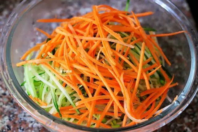3、把切好的黄瓜丝、胡萝卜丝、豆皮丝装入碗中。