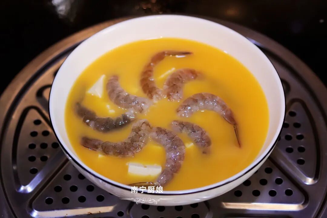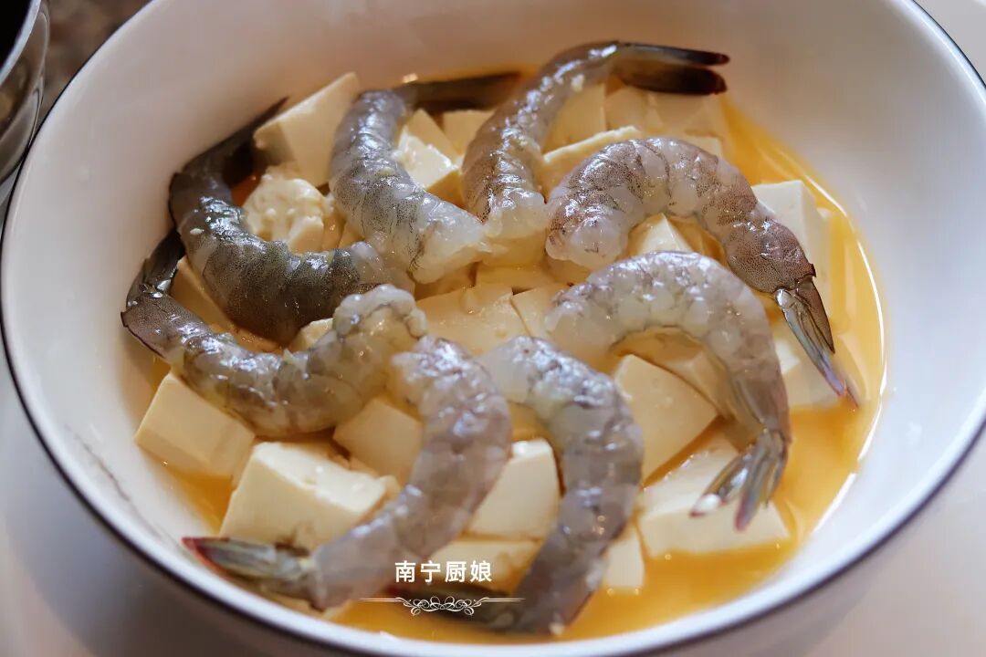 【食材】2个鸡蛋、120克嫩豆腐、100克鲜虾仁。