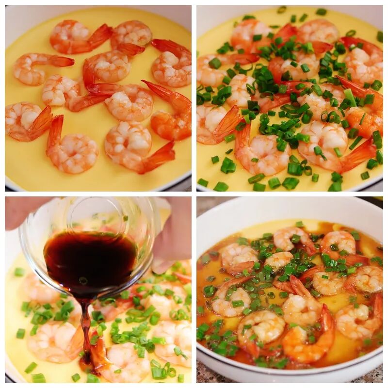 第五步:10分钟之后别急着开盖,关火继续让鸡蛋羹焖个3分钟,然后虾仁蒸蛋就可以出锅了,出锅之后将葱花撒在虾仁蒸蛋上,随后起锅烧热油,将热油淋在葱花上,最后再浇上10克生抽,一盘鲜美嫩滑的葱油鲜虾蒸蛋便制作完成了。