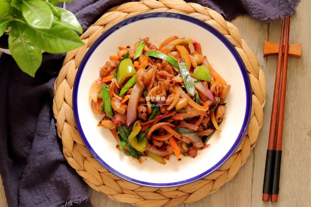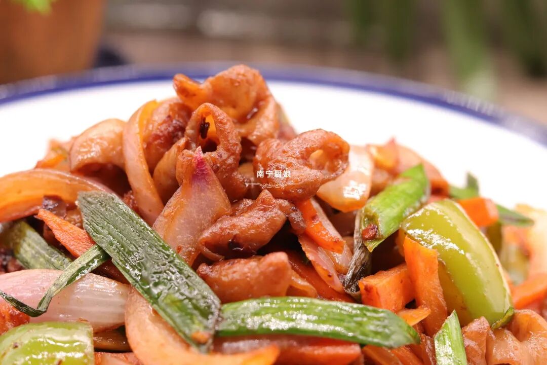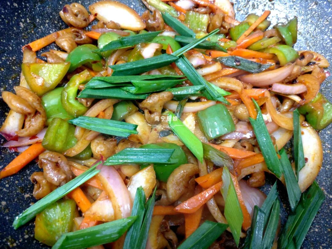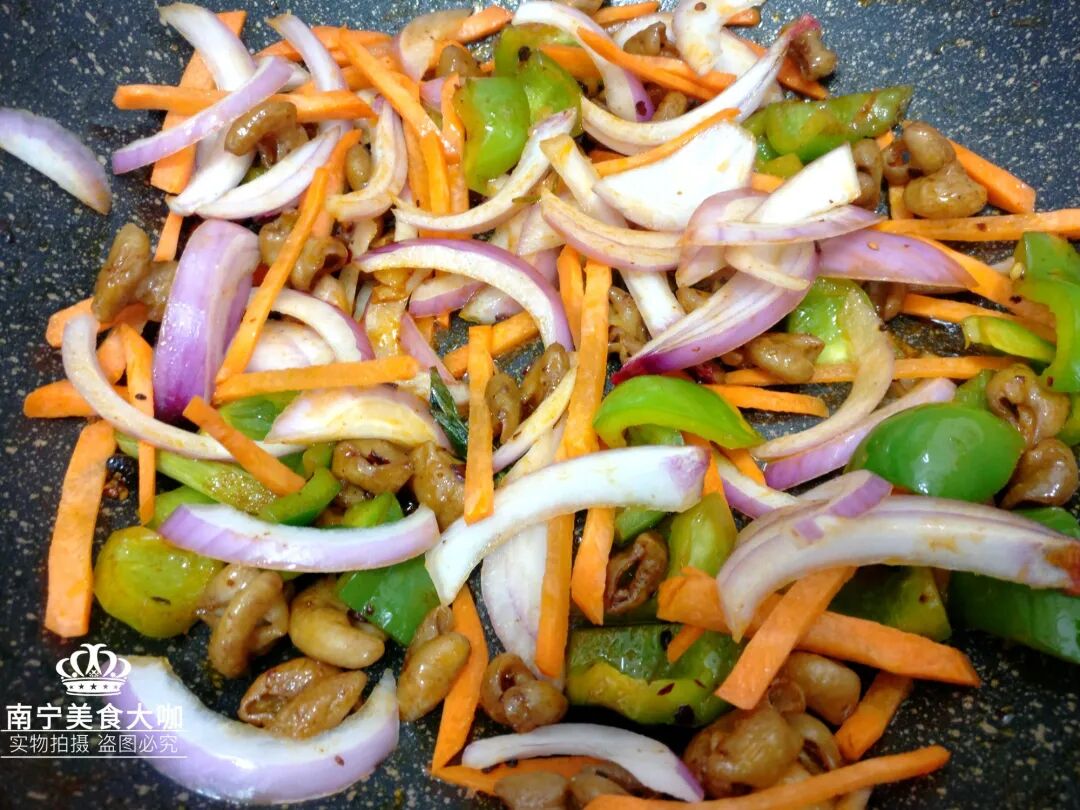 5、把青椒、胡萝卜和洋葱一起倒进去爆炒