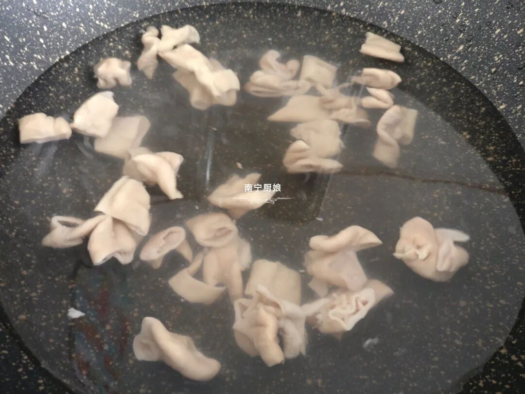 1、我买的肥肠超市帮清洗过了,不过还是有味道,回来我还要处理下,在锅里倒入半锅水,放入姜片,滴入几滴料酒好去味,把肥肠放进去,冷水烧煮把肥肠煮熟,再放进淘米水里搓洗几下,放到清水里冲洗2次,然后捞出来用手榨下水分,沥干待用