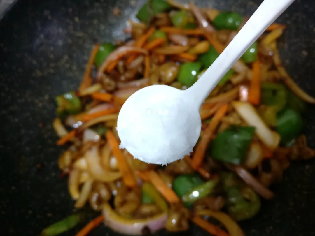 6、等洋葱半软后,放入一勺食盐调味(前面放过一次盐了,所有后面放的盐要少量点,要不然会咸死人哦)