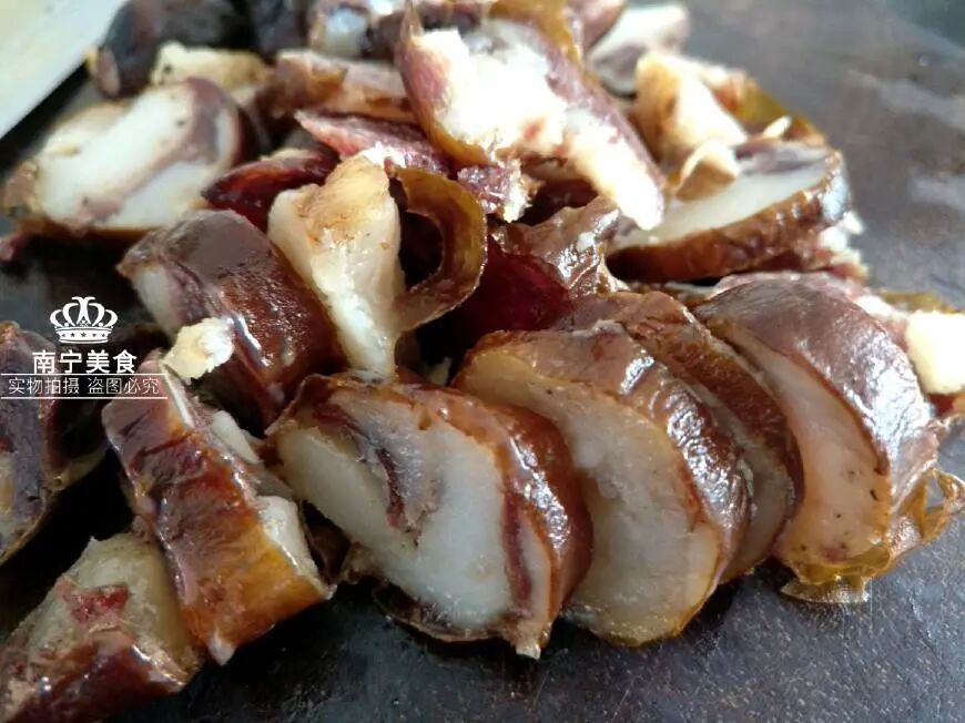 2、在盆里倒入半盆热水,把腊肠放进去清洗干净,然后过清水冲洗2次,把腊肠切片(如果大家用的不是烟熏腊肠可以不用这样清洗,因为我的是老家的柴火烟熏腊肠,表面都是烟灰所以需要热水清洗)