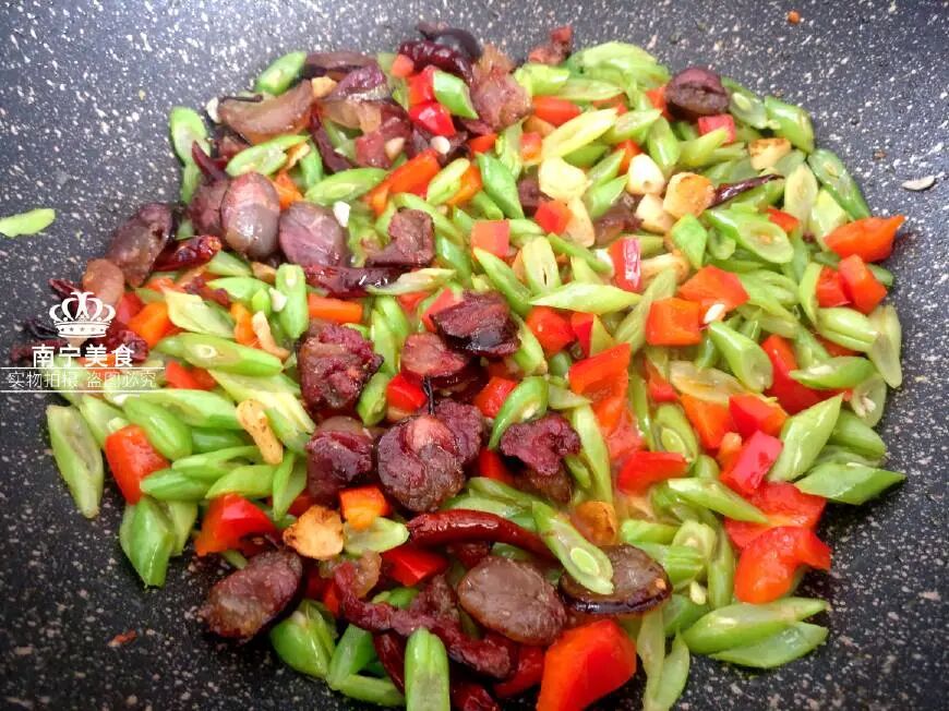 6、如果没有太多讲究的,可以继续使用干脆翻炒腊肠的底油,把四季豆丁和红甜椒粒倒进去一起中火翻炒2分钟