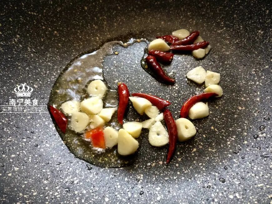 4、在开小火,把锅架上热锅,然后往锅里倒入花生油(我们家喜欢吃花生油),小火烧热后,把蒜米和干辣椒倒进去爆香