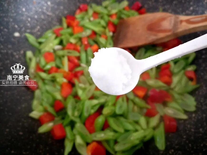 7、放入1小勺食盐就可以了,因为这个主要是给四季豆和甜椒调味的,后面放的腊肠本身已经有咸味了,所以不用放太多盐