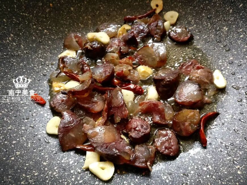 5、接着把切好的腊肠也倒进去一起翻炒香,然后盛出盘子待用
