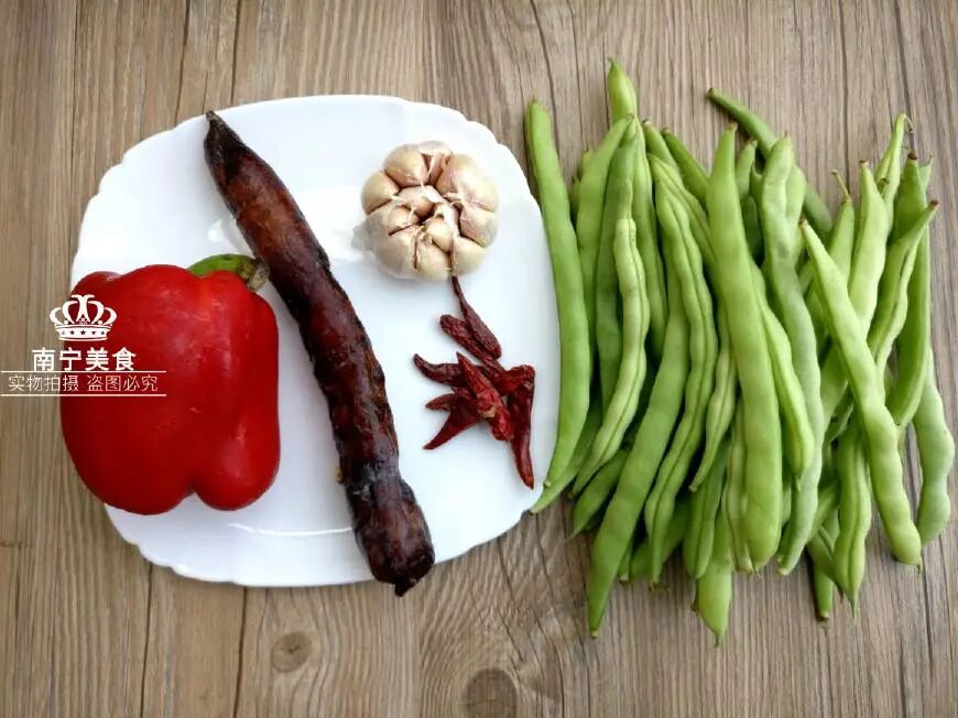 把食材准备好:四季豆400克、柴火腊肠一根、红甜椒1个、蒜米5粒、干辣椒6颗、食盐一小勺