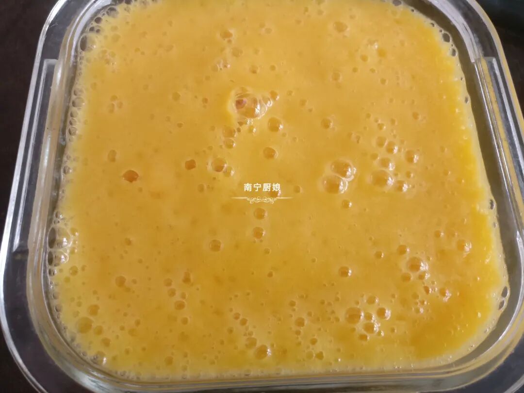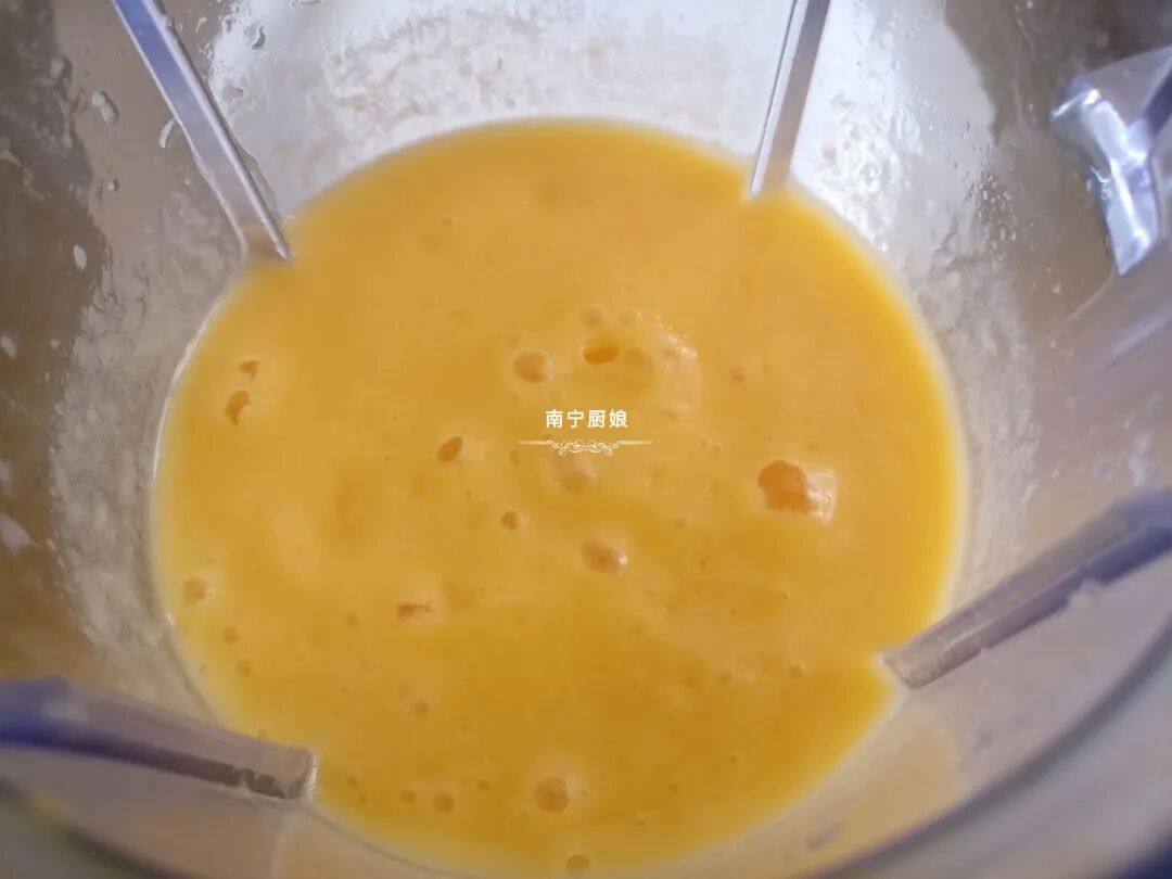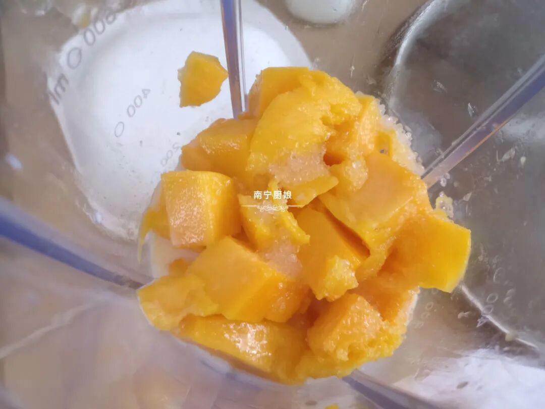 4、 开动搅拌机,把果肉搅拌成果酱,一开盖就一阵阵芒果的清香扑鼻而来,真是让人欲罢不能